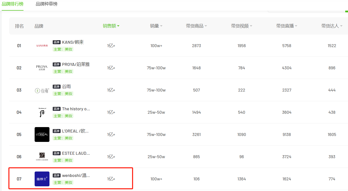 以温博士为例,在2023年12月以前还是寂寂无名的状态,但在此之后,其在抖音月销破亿已是常态。在今年1-5月,温博士每月都以1亿+的预估销售额,杀入抖音美妆品牌销售额TOP20榜,其中,2月份,温博士的排名相对最为靠前,位列榜单第7位。