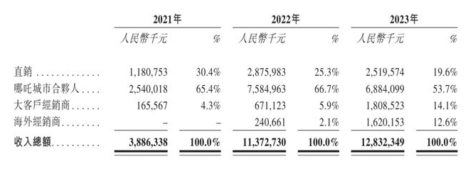 哪吒通过直营店和经销商渠道卖车,绝大部分车通过经销商卖出去。2023年,经销商为哪吒贡献了80.4%的收入。
