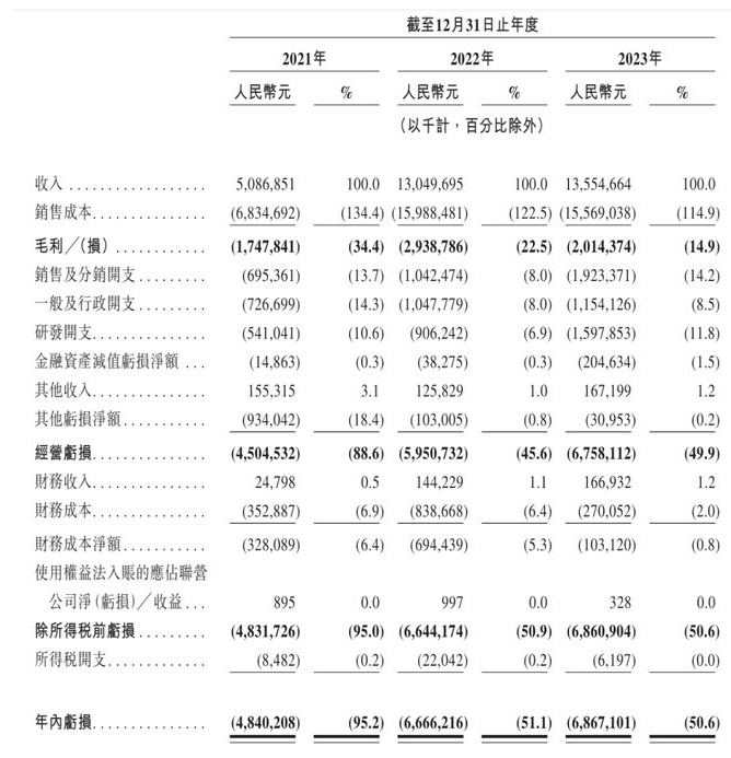 哪吒是真的在赔本卖车。它的毛利率一直是负数,过去几年虽有提升,但去年也还是-14.9%。而各种费用随着销量的增加水涨船高,销售及分销开支去年增加了9亿元,研发开支增加了7亿元,导致经营层面亏损加剧。