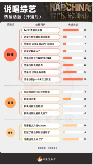 受限于题材,相比全民追看的《歌手2024》和受众群体更广泛的真人秀类综艺,两档以说唱为落点的节目显然没什么优势。