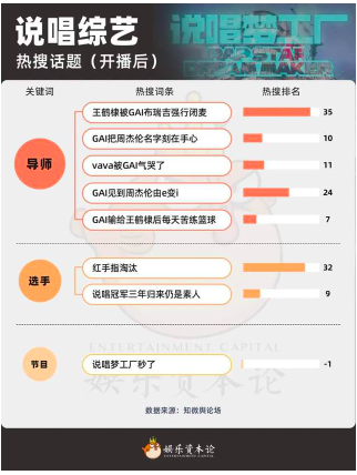 在微博热搜上,导师相关的热搜占据两个节目的一半以上,选手相关的热搜只有1/4不到。