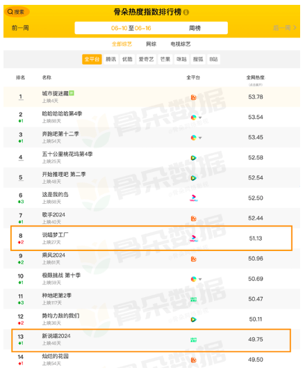 横向对比来看,根据骨朵数据上周综艺热度榜单,两档节目都进入了同期综艺节目的热度前15,但都处于中下游位置,热度明显不足。
