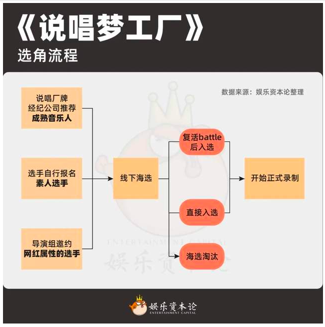 首先,在选角方法上,《说唱梦工厂》的制作方大千影业和种梦D.M.G重启了电视选秀常用的海选模式。报名选手经初步筛选后收到海选资格,到不同城市的海选站点参加线下面试,面临淘汰和复活赛。从去年10月到今年4月节目正式开始录制,整个海选持续半年时间。