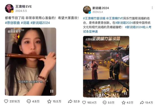 这首竹笛和rap融合的中国风说唱在节目官方号上收获了102万点赞,选手自己随后发布的翻唱视频点赞高达237万。