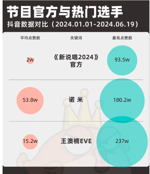 至于今年最红的Rapper,自然是节目里“一轮游”的诺米。截至目前,诺米的抖音粉丝数超过329.6万,视频的平均点赞数达53.8万。而《新说唱2024》官方抖音号平均点赞数只有2万。