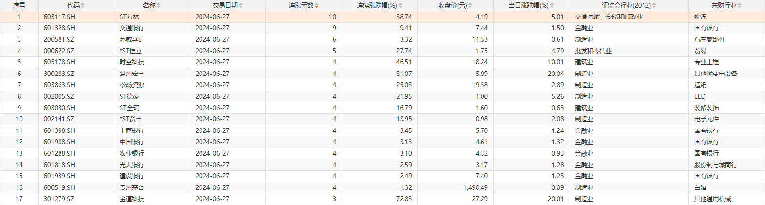 6月27日,Choice数据统计,今日1只个股连续10天上涨,为ST万林;1只个股连续9天上涨,为交通银行;此外,*ST恒立连续5天上涨;时空科技、温州宏丰、工商银行等12只个股连续4天上涨。