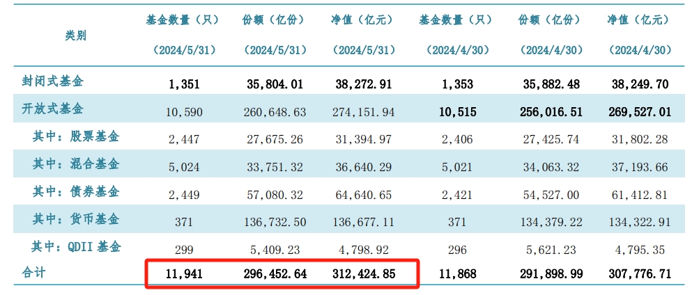 继4月末首次突破30万亿元大关后,今日,中基协公布的最新数据显示,截至5月底,我国境内共有基金管理公司148家,取得公募基金管理资格的证券公司或证券公司资产管理子公司13家、保险资产管理公司1家。以上机构管理的公募基金资产净值合计31.24万亿元。