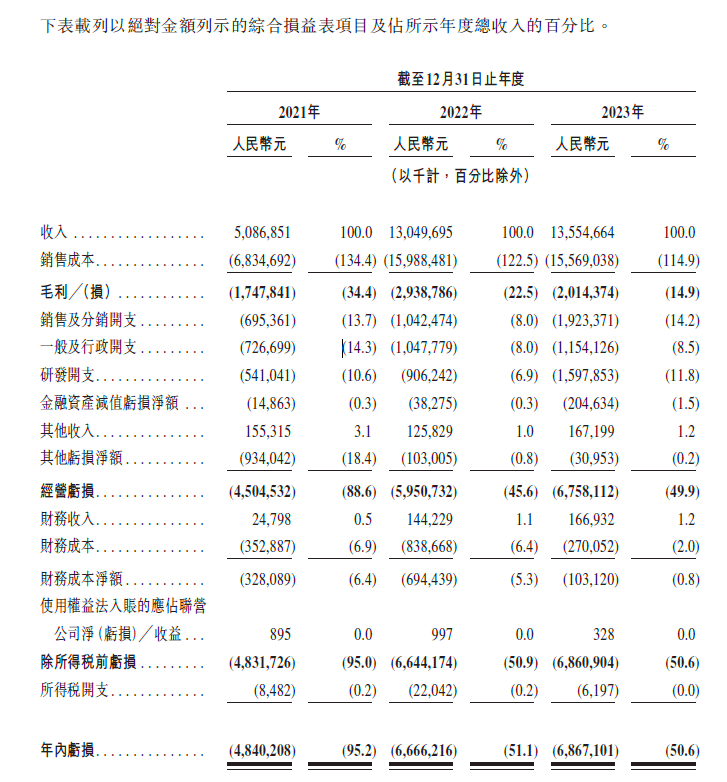 2023年哪吒录得营收为135.56亿元,同比仅增长4%。但同样也因为哪吒S的高成本和低销量难以摊薄汽车生产成本,2023年单车平均销售成本比2022年增加了1.7万元。