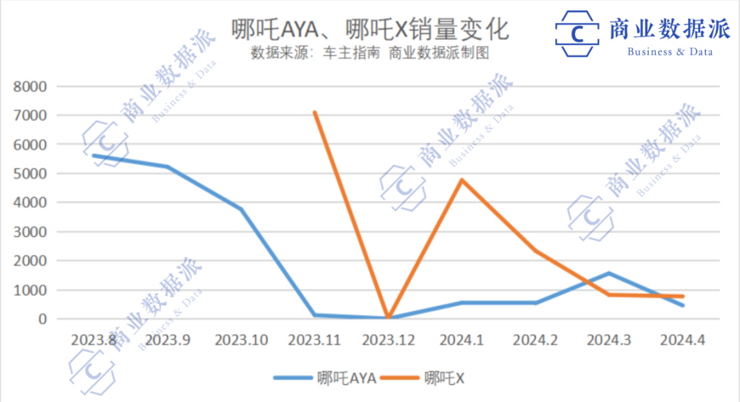 在10万~15万这个消费者极度敏感的价格段里,哪吒一边涨价,一边几乎“换汤不换药”升级的态度,使得哪吒后来虽进行了价格调整,但消费者还是用真金白银做出了选择。销量数据显示,哪吒X和哪吒AYA在交付前几个月维持了几千的销量,随后便“一头栽倒”。