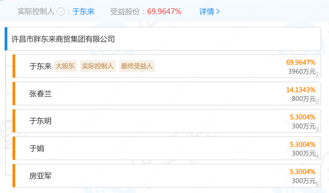 企查查数据显示,许昌市胖东来商贸集团有限公司法人为于东来,持股前五分别是:于东来持股69.96%、张春兰持股 14.13%、于娟持股 5.3%、于东明持股 5.3%、房亚军持股 5.3%。
