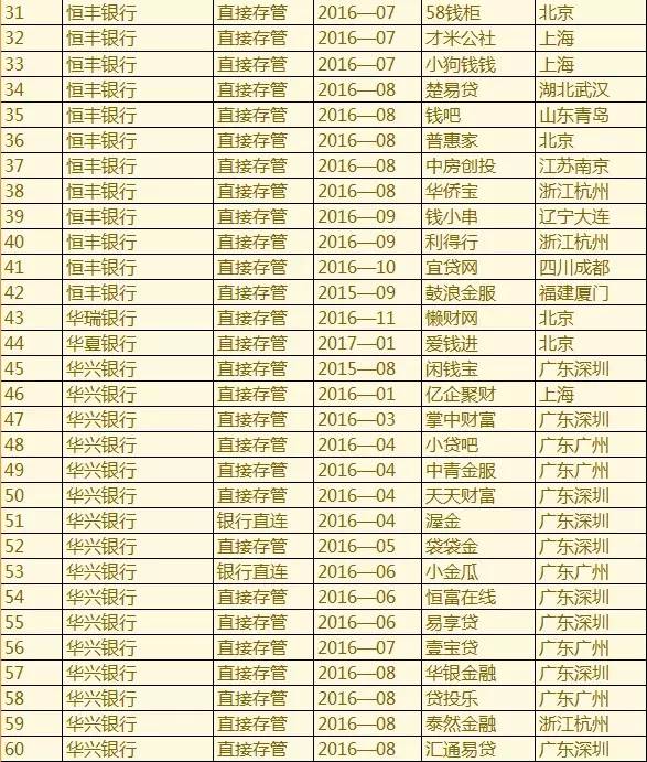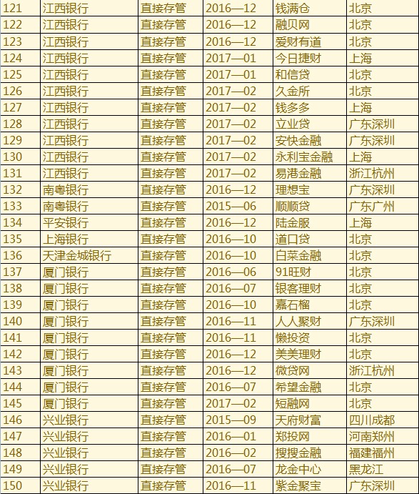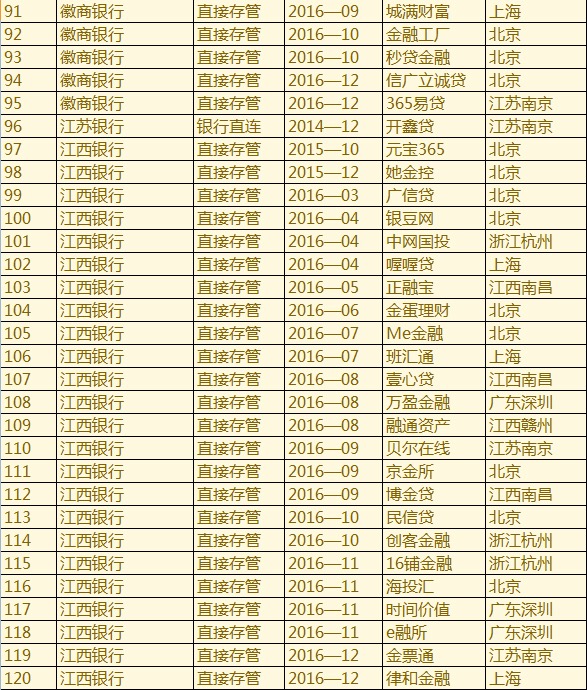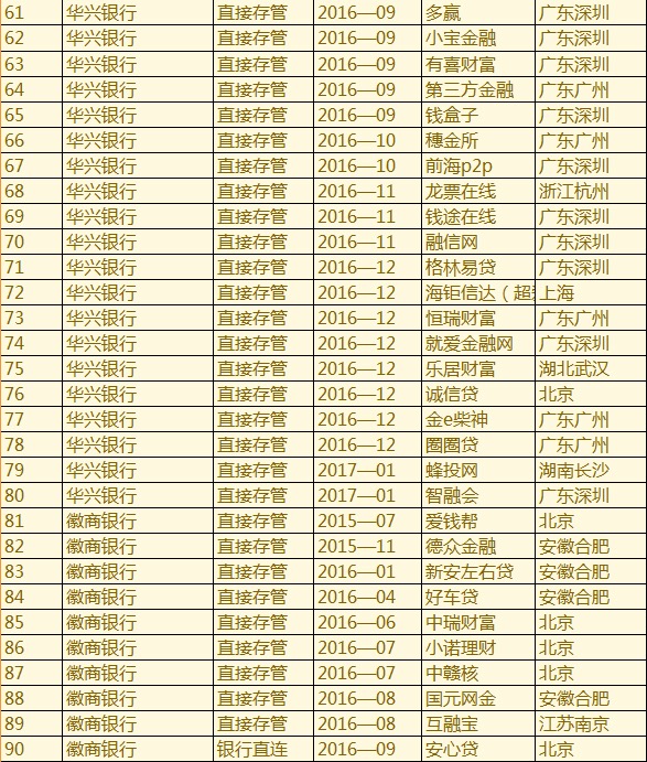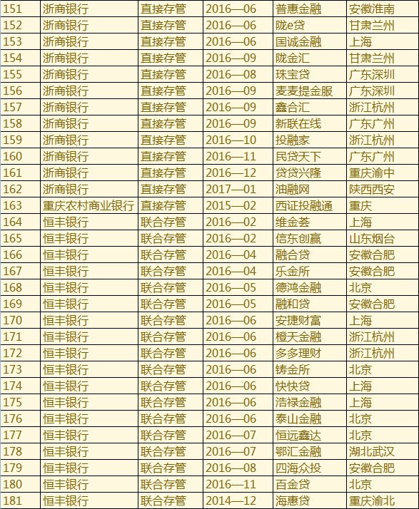 而据统计在已经实现资金存管的183家平台中,其中实行联合存管的平台共18家,而随着《存管指引》的下发,“银行+第三方支付”的联合存管模式未能得到监管认可,这18家平台即将面临整改,他们分别是:融合贷、维金荟、信东创赢、融合贷、乐金所、德鸿金融、融和贷、安捷财富、橙天金融、多多理财、铸金所、快快贷、浩禄金融、泰山金融、恒远鑫达、鄂汇金融、四海众投、百金贷、海惠贷。