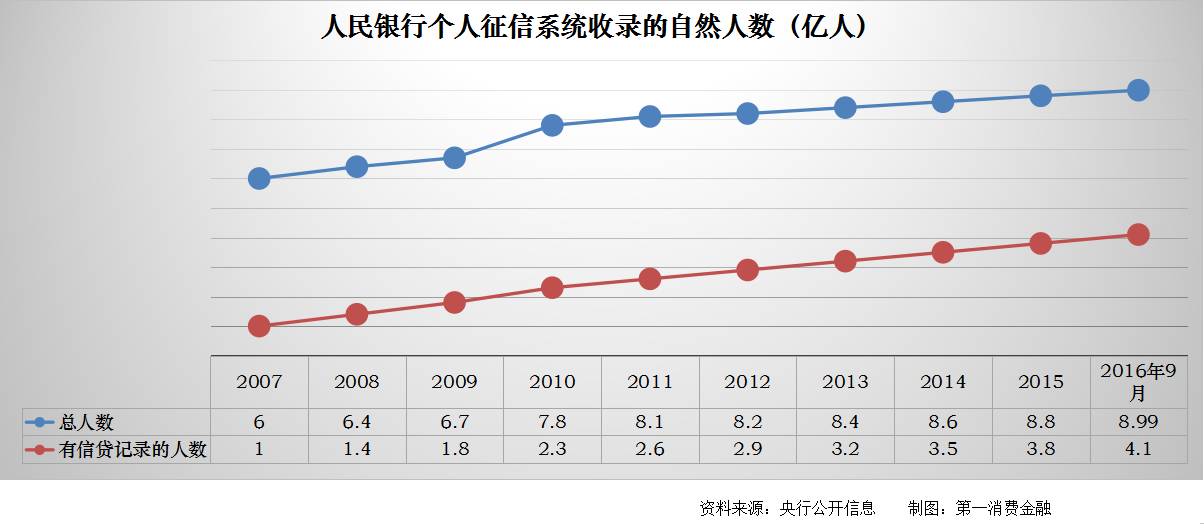 然而,以个人征信为例,央行征信系统的覆盖极为有限。截止2016年9月,央行个人征信系统共有2927家接入机构,收录自然人数8.99亿,其中4.12亿人有信贷记录。