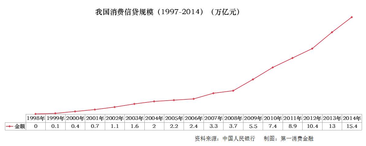 据央行数据,我国消费信贷规模稳健增长。据央行统计,我国消费信贷规模由1997年的172亿元增加到了2014 年的15.4万亿,增长了895倍。