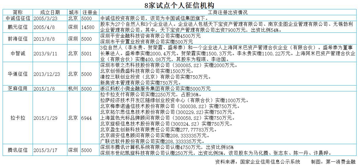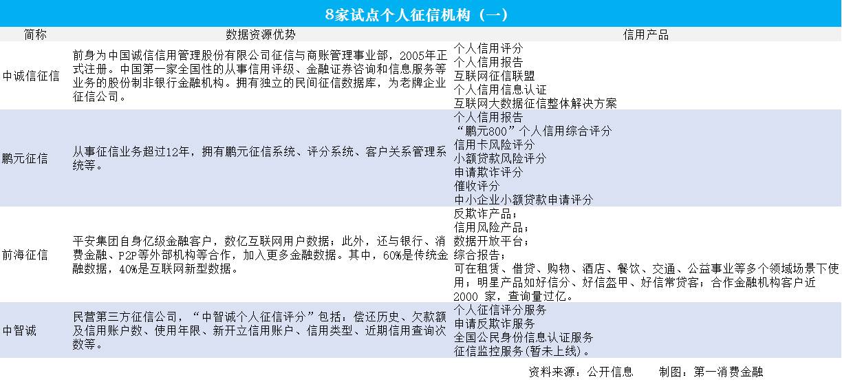 据国务院2015年1月5日发布的公告,央行印发了《关于做好个人征信业务准备工作的通知》,要求芝麻信用、腾讯征信、中诚信征信等八家机构做好个人征信业务的准备工作。此举意味着,以上八家或将首批获得个人征信牌照。