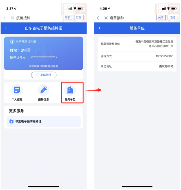 第三步:进入“疫苗接种”服务,点击“电子接种证”,进入“山东省电子接种证”导航页,即可获取电子接种证,并可实现“亮码接种”、个人信息和接种信息查询、服务单位信息查询、在线预约等功能,并可导出电子接种证PDF版文件,儿童受种者还可导出入托、入学预防接种完成情况评估报告。
