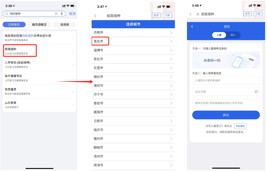 第二步:进入“爱山东”首页,搜索“疫苗接种”,点击“疫苗接种”,选择青岛市,通过预防接种档案编码或身份证号码进行受种者信息绑定;
