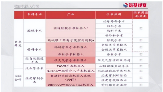 而微创机器人,则在讲述“大而全”的故事,其在手术机器人领域的管线布局颇为广泛。既有对标达芬奇的“图迈”,也有与天智航、捷迈等国内外骨科选手对垒的“鸿鹄”。另外,其还布局了经支气管手术机器人、TAVE手术机器人等前沿领域。