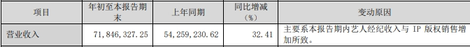 根据欢瑞2024年一季度财报数据,报告期内公司营业收入为7184.63万,比去年同期增长了32.41%,在未有新剧播出的情况下依旧能实现增长,主要是受艺人经纪收入与IP 版权销售增加所致。