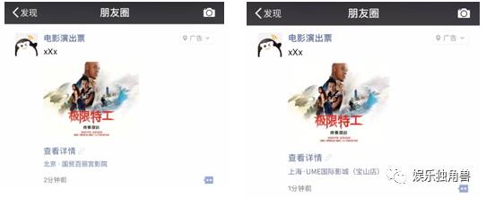 微影基于拥有的微信朋友圈资源,进行了创新的广告玩法:影片广告投向一、二线单体影城周边3公里范围内15至40岁微信用户,覆盖旅游、餐饮美食、生活服务、互联网、电子产品、游戏、娱乐休闲等属性人群,实现地区、时间的双重精准触达。