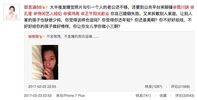2月22日深夜,演员张棪琰微博晒出一组自拍照,到了23日晚上被王柏川扮演者张陆的妻子邵思涵转发,邵思涵指张棪琰当小三,勾引自己老公张陆。