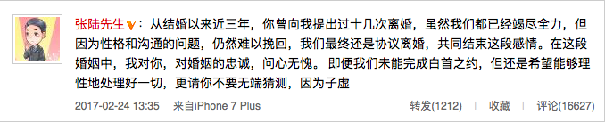 2月24日,张陆发微博回应出轨风波,称两人早已离婚,离婚由邵思涵提出,是因为性格和沟通的问题,张陆还称对婚姻的忠诚问心无愧,希望不要无端猜测对孩子造成二次伤害。