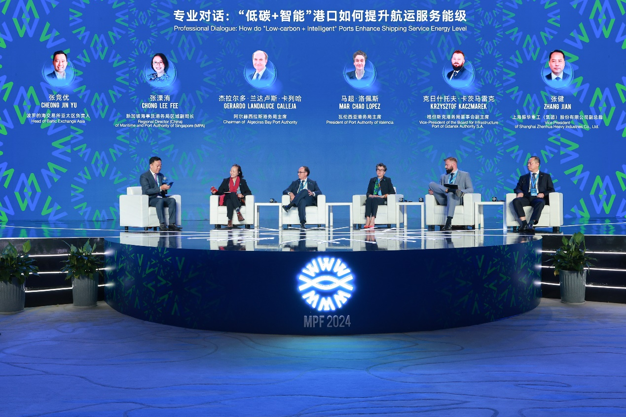 会场里,鲜明的MPF标志格外醒目,蓝绿相间的条纹铺展在会场每个角落,处处洋溢着共建“一带一路”、携手打造港航命运共同体的时代氛围。