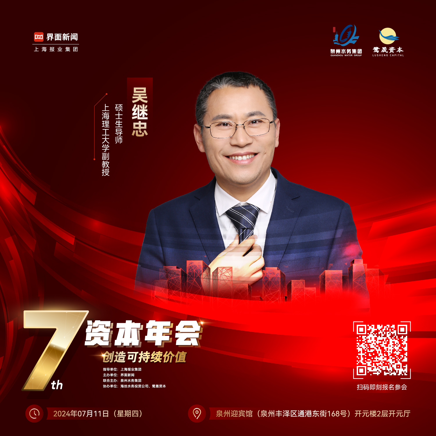 由上海报业集团作为指导单位,界面新闻主办、泉州水务集团有限公司联合主办,泉州海丝水务投资有限责任公司、泉州鹭晟私募基金管理有限公司作为协办单位【2024资本年会】确认将于7月11日(星期四)在泉州迎宾馆(泉州丰泽区通港东街168号)举行。(点击“2024资本年会”即刻锁定年会参会名额)