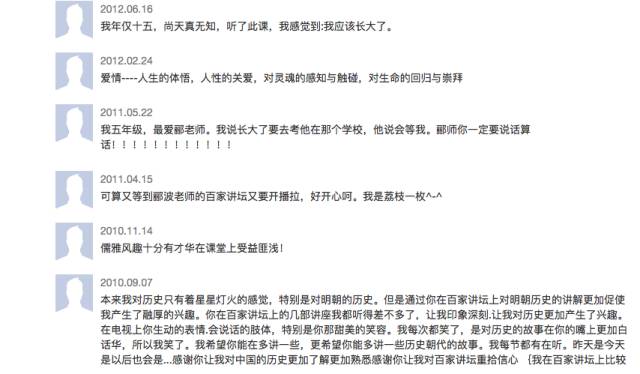 郦波在《百家讲坛》讲爱情故事的愿望最终实现是在2015年,那年暑假他在《百家讲坛》主讲了“千古爱情之相聚在星空下”。允许郦波讲爱情故事可以算作以专业讲解著称的《百家讲坛》的一次妥协。但这次妥协并没改变《百家讲坛》日渐没落的命运。这种没落是随着于丹、袁腾飞等人的争议开始的,鸡汤、误读、庸俗化解读是争议核心。