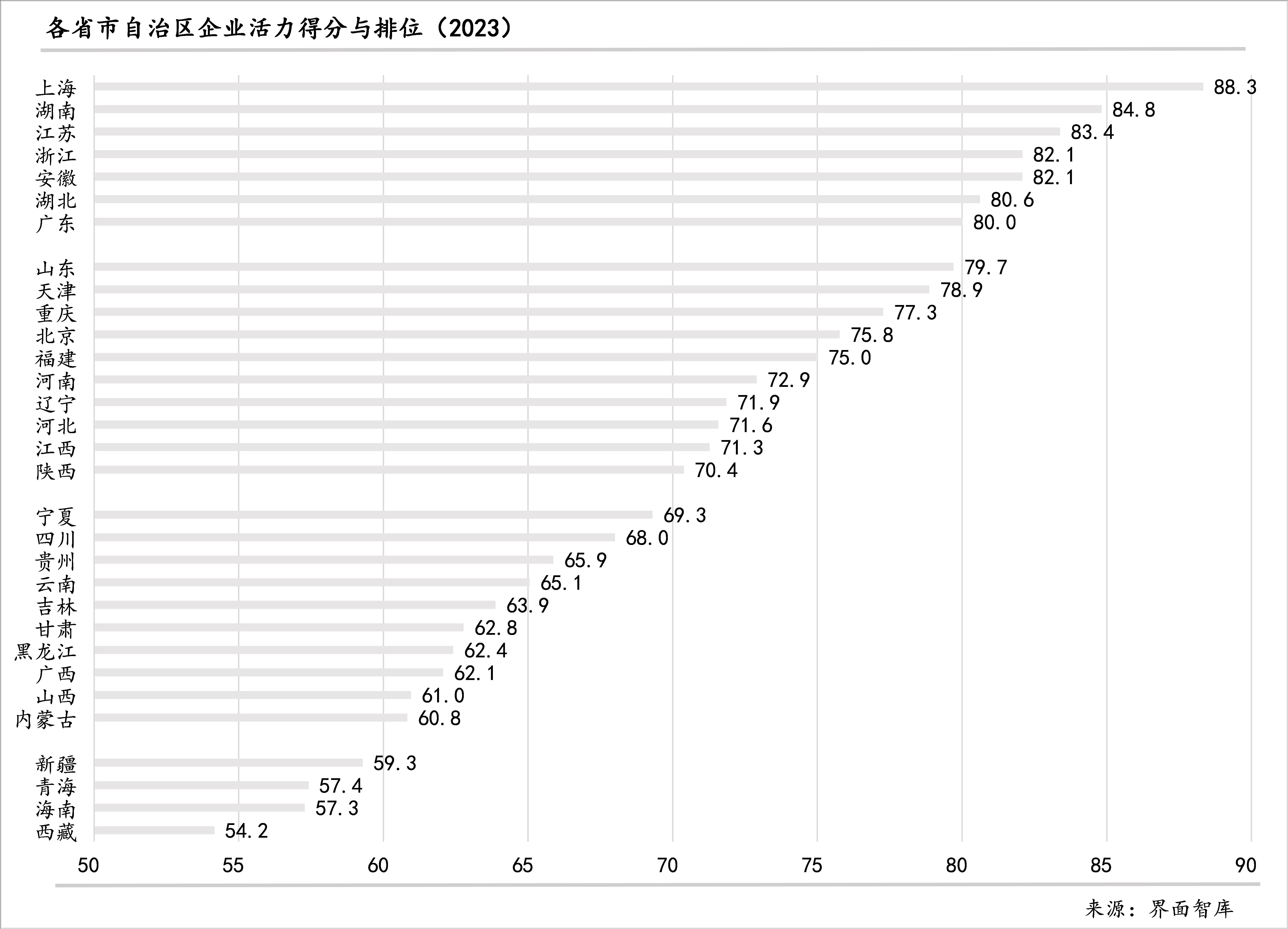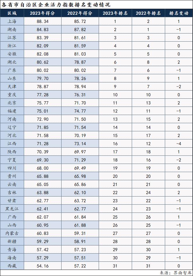 一、在企业活力指数的最终得分方面,上海、湖南、江苏位列前三。