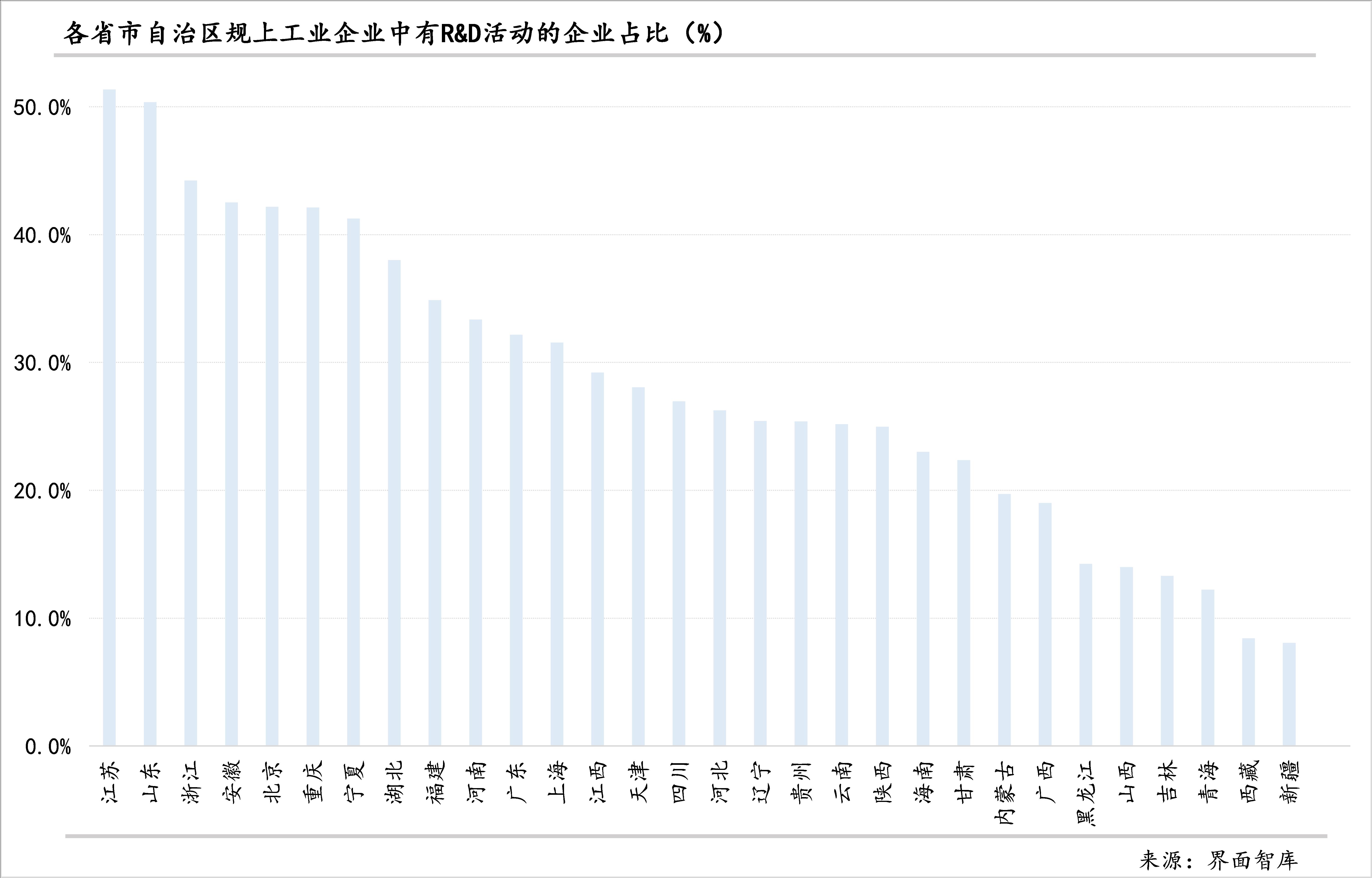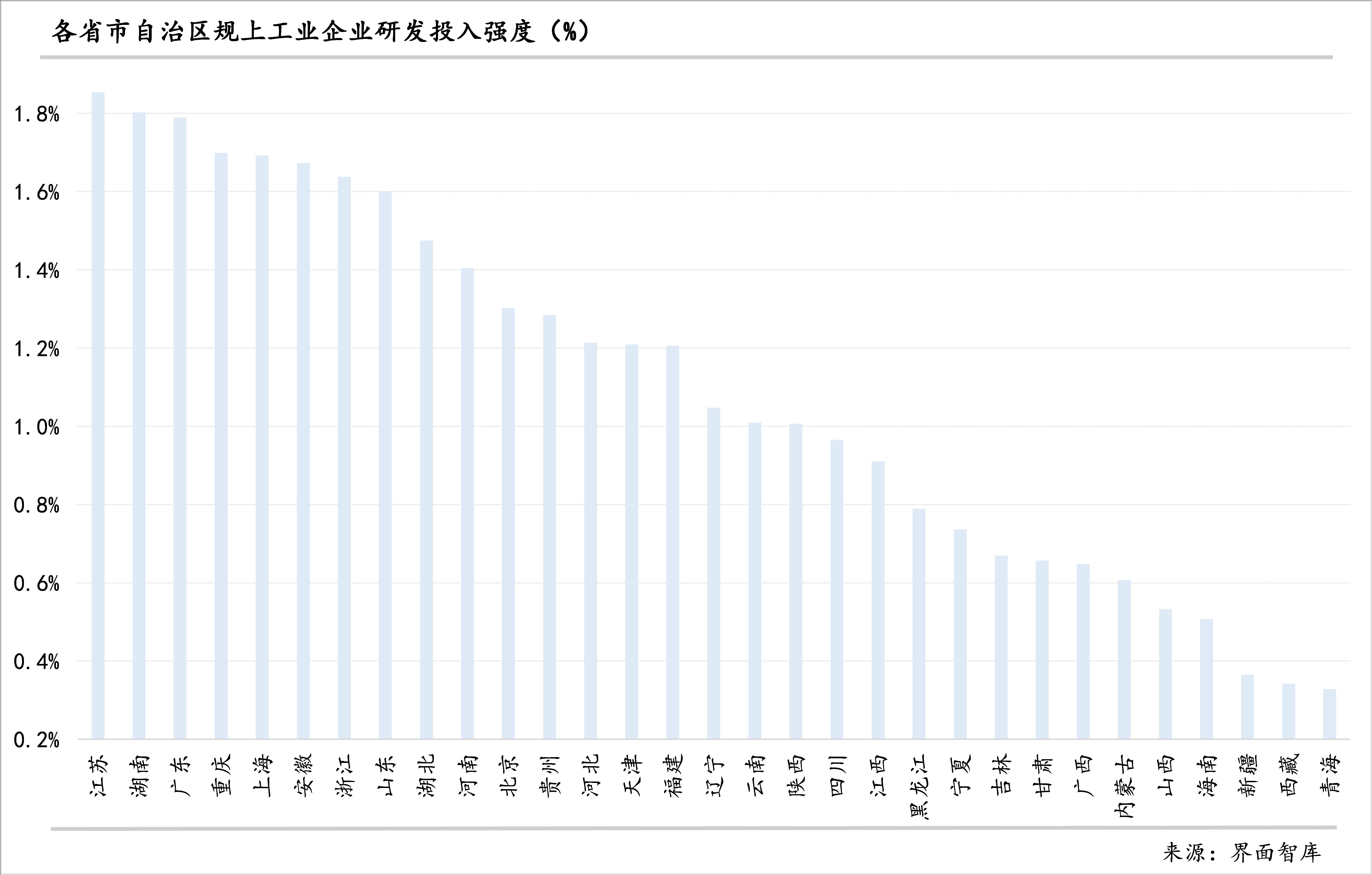 湖南和江苏则主要受益于规上工业企业的研发活力。两地的规上工业企业中有研发活动的企业占比都过了半数、在各省份中分列前两位;与此同时,两地的规上工业企业研发经费与规上工业企业营业收入的比值也是各省中最高的,是唯二超过1.8%的省份(江苏第一、湖南第二)。