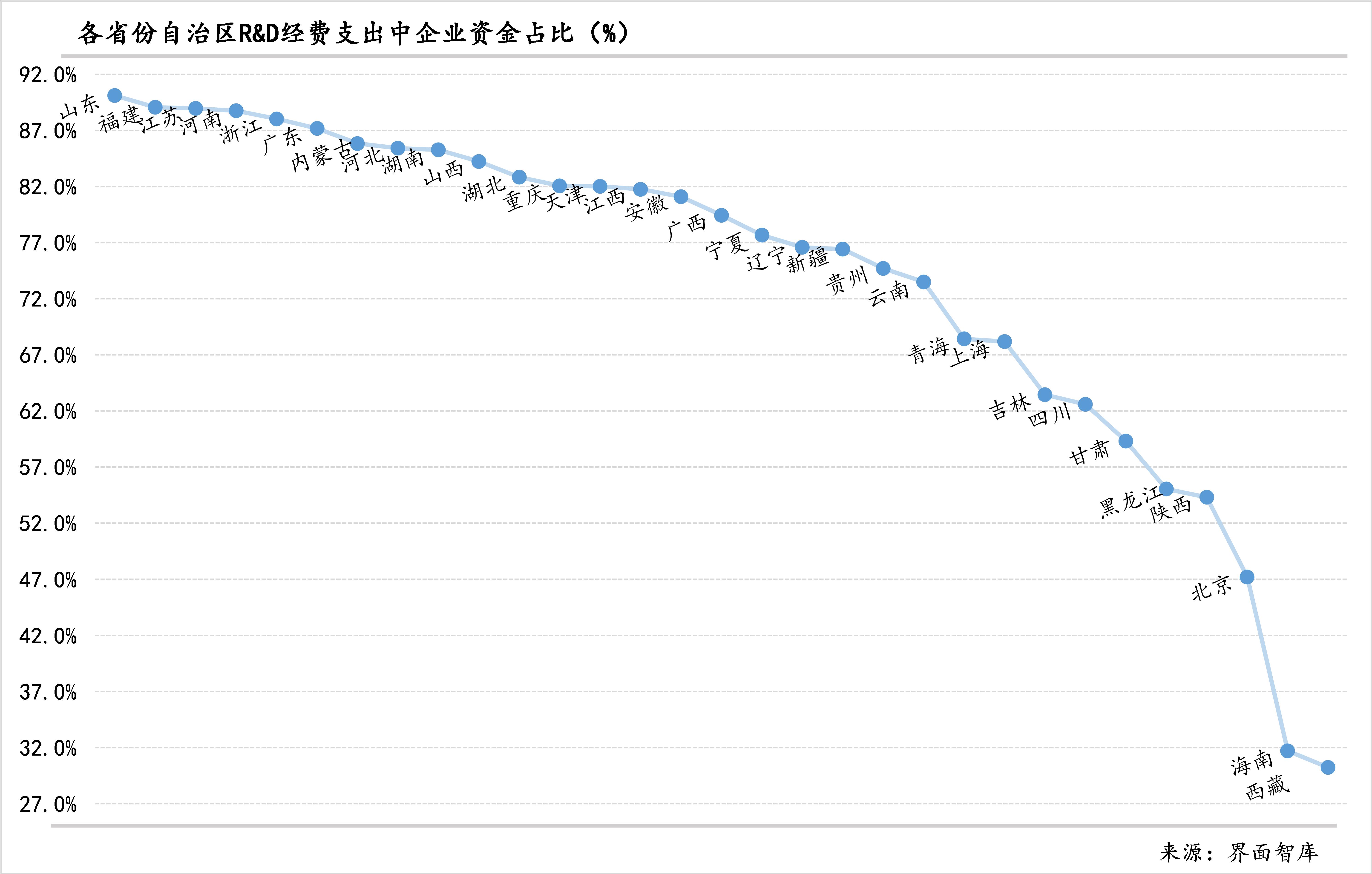 从R&D经费支出中企业资金占比来看,山东最高,其研发资金来自企业的比例高达90.1%,福建紧随其后、达89.1%,江苏、河南、浙江、广东来自企业的比例也都在88%上下;在80%以上的省份还有9个,依次为内蒙古、河北、湖南、山西、湖北、重庆、天津、江西、安徽;处于70%-80%的省份相对较少,仅有6个,依次为广西、宁夏、辽宁、新疆、贵州、云南;有个四个省份的企业资金占比在60%-70%,分别为青海、上海、吉林、四川;其余不足60%的六个省份中,西藏和海南企业资金占比都在三成左右、北京研发资金中来自企业的部分则不足一半,甘肃、黑龙江、山西均超过54%。