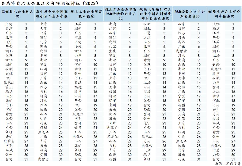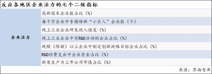 企业是新质生产力和新动能发展的重要力量,因此,界面智库在对区域科技创新能力进行评估时将企业活力列为四个一级指标之一。该指标主要反映企业在创新研发方面的活力,具体由7个二级指标构成,分别反映当地拥有的在国家支持的特定领域能够自主创新持续创新的企业数量、当地拥有的中小微企业创新领头羊、企业收入中用于研发的比例、已经开展研发的企业比例、有创新意识并开始采取行动的企业比例、当地研发中企业参与的程度、当地新质生产力上市公司的占比情况等。