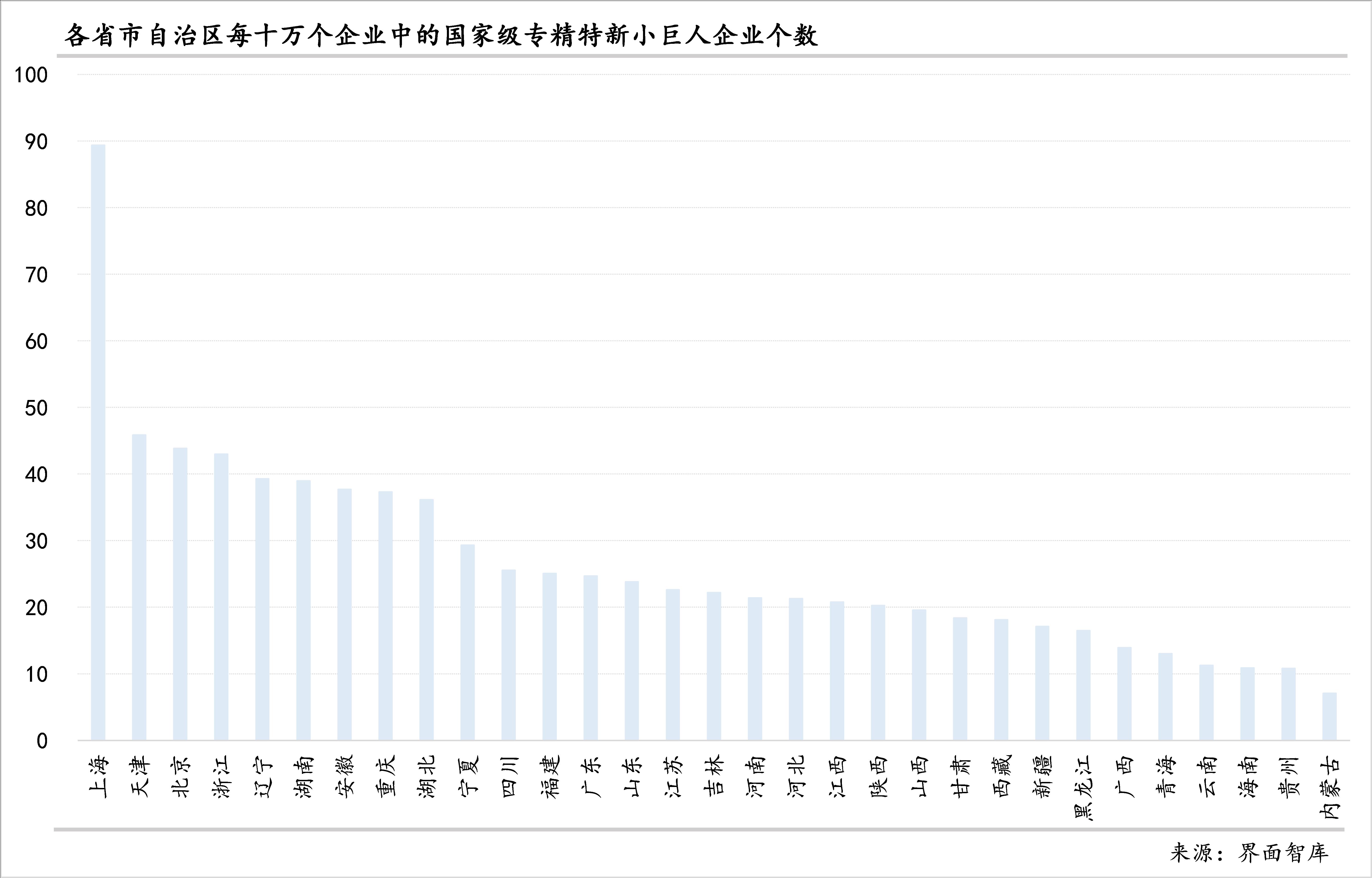 从每十万个企业中小巨人企业个数来看,除上海领先外,天津、北京、浙江相近、都在42-46之间,有五个省份在36-40之间,从高到低依次为辽宁、湖南、安徽、重庆、湖北。其他省份每十万个企业中小巨人企业个数都不足30个,其中,有11个省份在20-30之间,有10个省份在10-20之间,只有1个省份不到10。在小于20的省份中,中部只有山西、东部只有海南,其余都是西部省份。广东、山东、江苏虽然经济体量大、企业法人数多(在各省中居前三),但“专精特新”小巨人企业占比在各省中仅处于中等偏上。