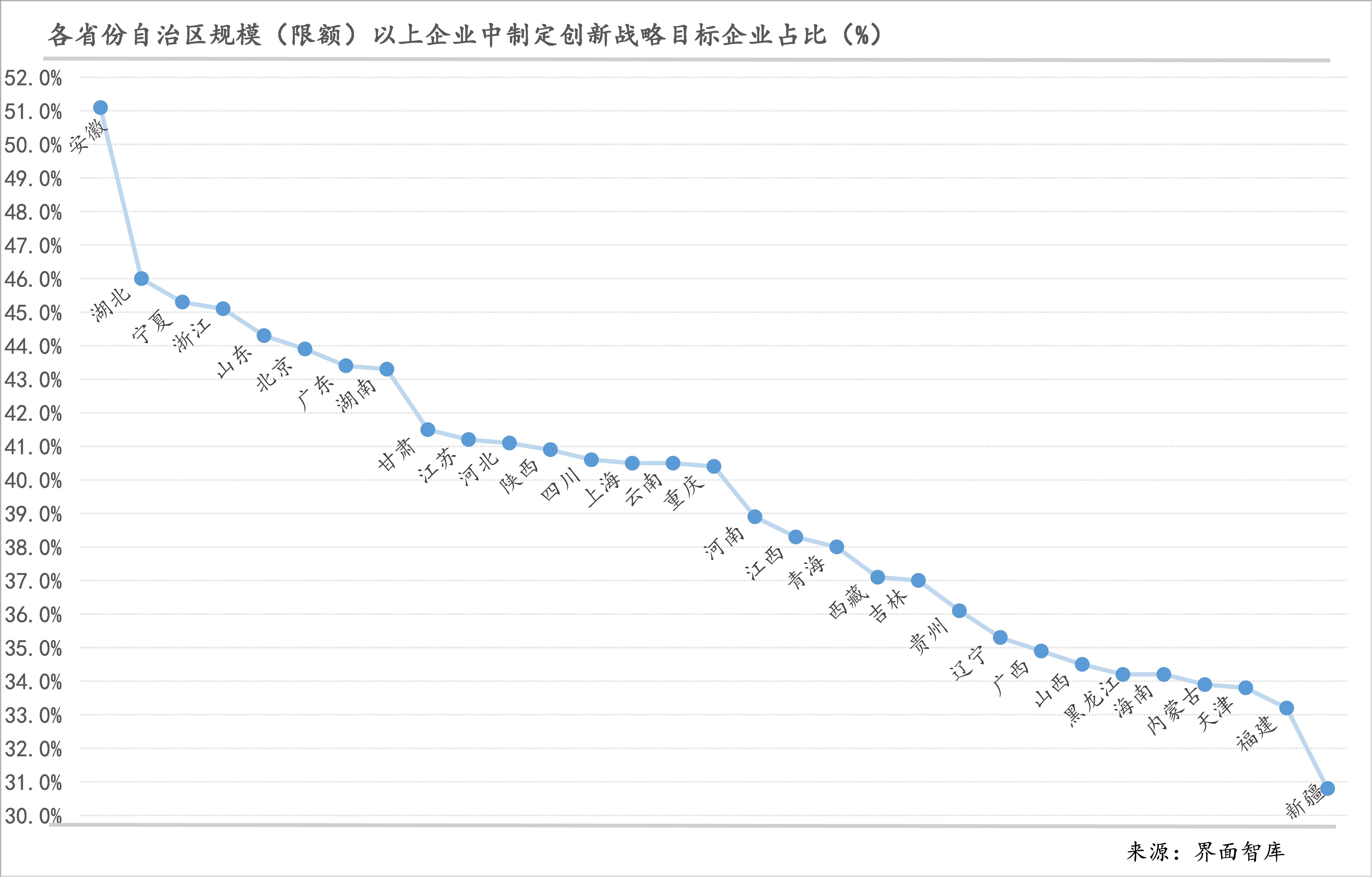 从规模(限额)以上企业中制定了创新战略目标企业占比来看,安徽最高、达51.1%,也是唯一过半的省份;湖北、宁夏、浙江则超过了45%、不足47%、排2、3、4位;在40%-45%之间还有12个省份,山东、北京、广东、湖南、甘肃、江苏、河北都超过了41%,另外5个省份都略超40%;其他省份则都在30%-39%之间。