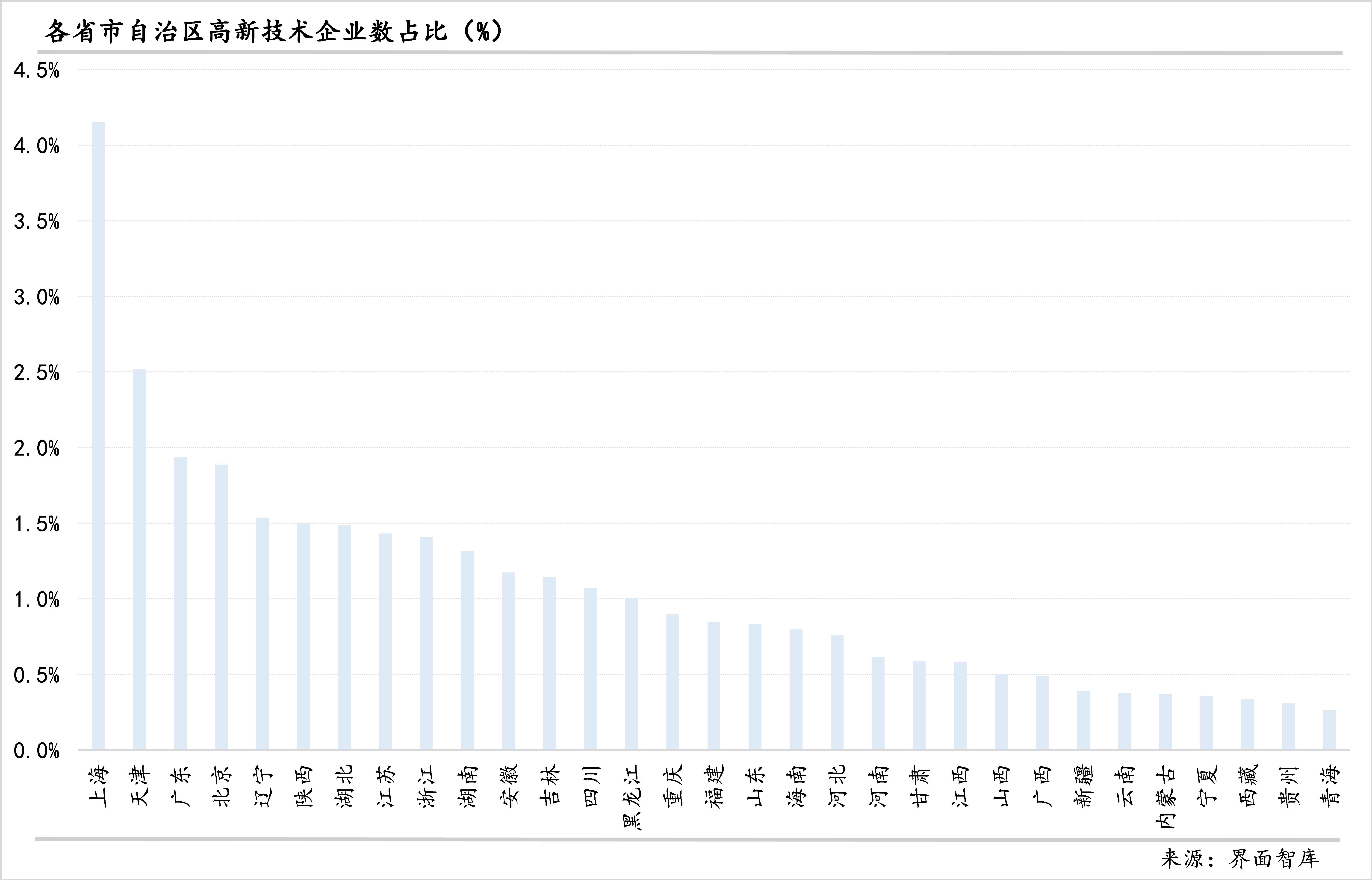 从入统的高新技术企业数占比来看,除上海超过4%以外,只有天津超过了2%。在其他29个省份中,广东、北京、辽宁的高新技术企业占比1.5%-2.0%之间,在1%-1.5%之间以及在0.5%-1%之间都各有9个省份,高新技术企业在企业中的比重不足0.5%的省份仍有8个,都是西部地区省份,从高到低依次为广西、新疆、云南、内蒙古、宁夏、西藏、贵州、青海。