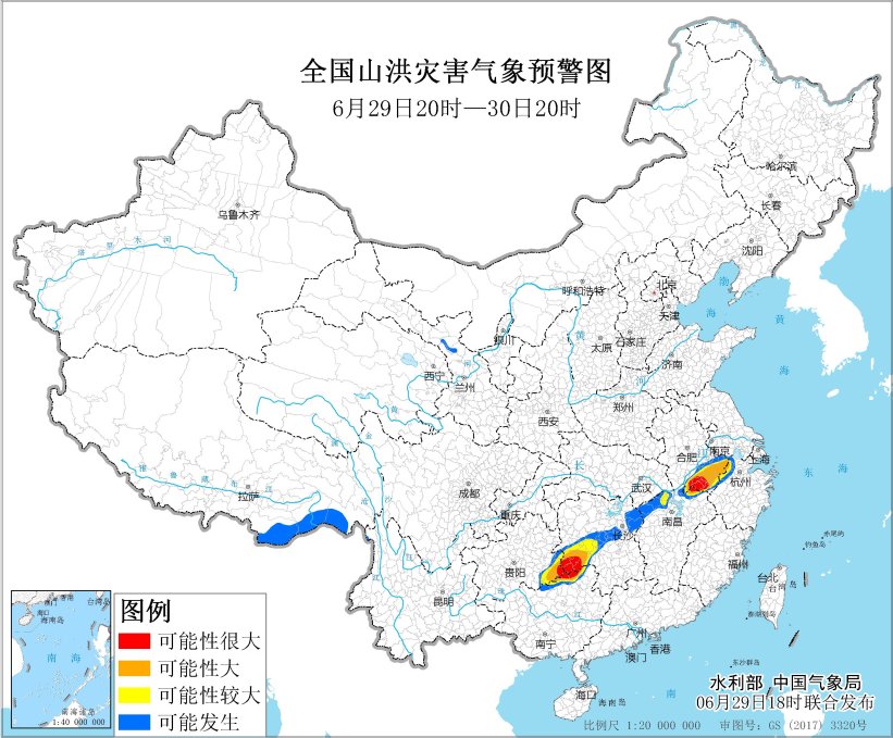 预计,6月29日20时至30日20时,浙江西北部、安徽南部、江西东北部、湖南西部、广西北部、贵州东南部等地部分地区发生山洪灾害可能性大(橙色预警),其中,安徽南部、江西东北部、湖南西部、广西北部、贵州东南部等地部分地区发生山洪灾害可能性很大(红色预警)。其他地区也可能因局地短历时强降水引发山洪灾害,请各地注意做好实时监测、防汛预警和转移避险等防范工作。