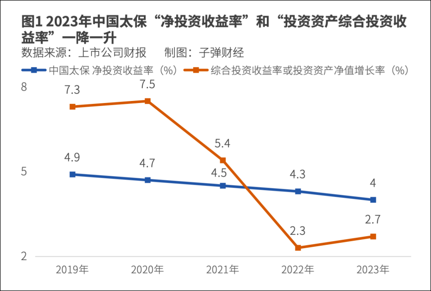 但另一项指标“投资资产综合投资收益率”出现向好迹象、触底回升。这一数据在2023年以前有另外一个名字,被记为“投资资产净值增长率”,从2020年的峰值7.5%明显下滑到2022年的2.3%,后又在2023年回升到了2.7%。
