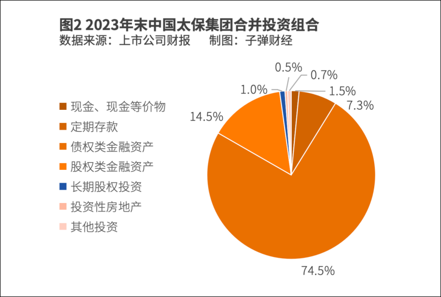 放在资产端整体来看,这类高风险、高回报的另类投资额占比并不高。财报数据显示,2023年末,中国太保集团管理资产规模2.25万亿元,较上年末增长15.0%。按照投资对象分类,2023年公司长期股权投资从258.29亿元下滑到231.84亿元,在整体资管规模里的占比仅有1%。