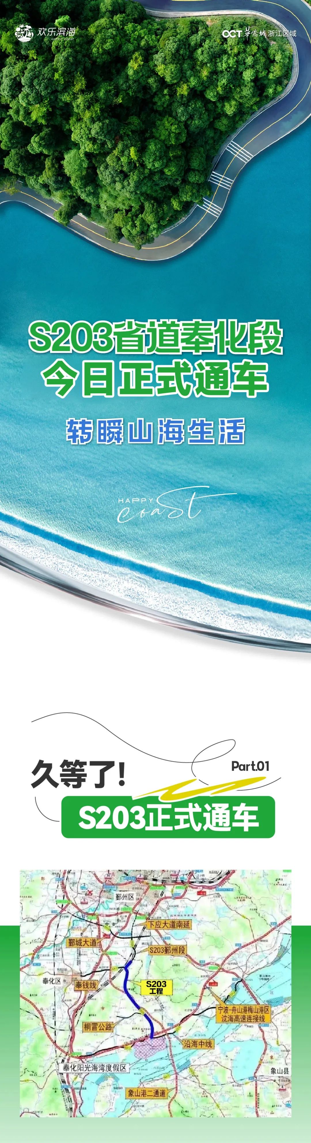 无论你从宁波的哪里出发,繁华的路网链接你向往的这片海,S203省道的正式通车,是奉化区域发展提速的重要里程碑,也是启幕城市美好度假目的地新篇章。