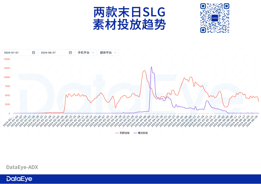 末日题材,《荒野迷城》早在2月上线初期就开始中幅投放,在《曙光防线》上线前期出现投放高峰提前抢量狙击。《曙光防线》4月才姗姗来迟,从4月9号到23号短暂大手笔投放后,就快速下滑,目前基本停止投放,“高光”仅维持半个月。