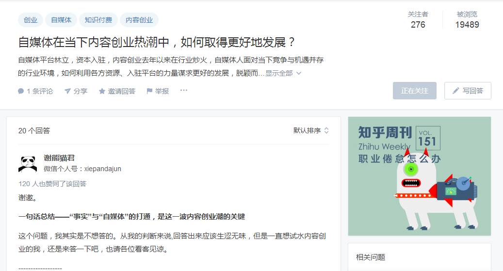 恰巧,这几天知乎上也有关于自媒体生存和发展的话题讨论,“自媒体人面对当下竞争与机遇并存的行业环境,如何利用各方资源、入驻平台的力量谋求更好的发展?”