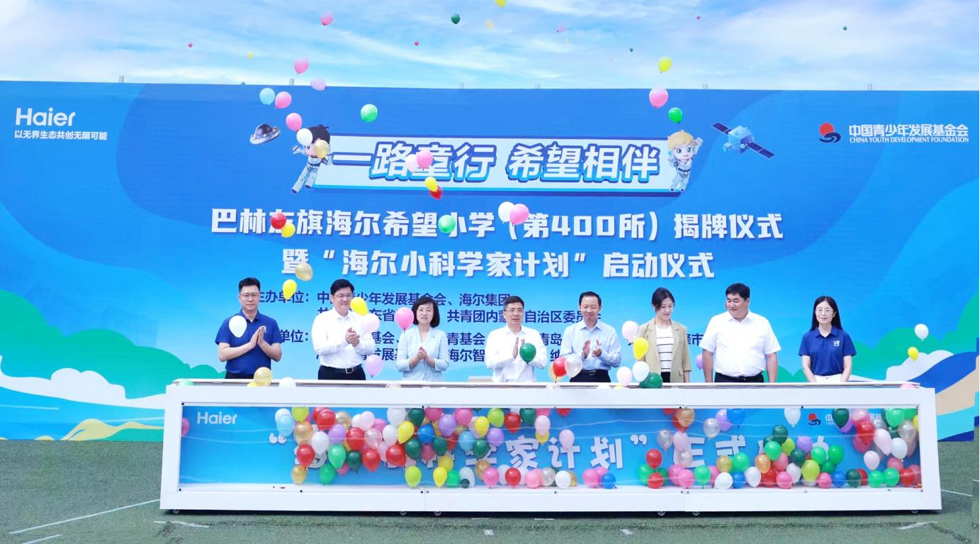 6月28日,在内蒙古自治区赤峰市的巴林左旗,巴林左旗海尔希望小学正式揭牌,今年是海尔集团创业40周年,这也是海尔集团援建的第400所希望小学。在此次活动上,海尔集团董事局主席、首席执行官周云杰宣布将继续携手中国青少年发展基金会等相关部门和组织,启动全新的海尔希望小学公益项目——“海尔小科学家”计划。