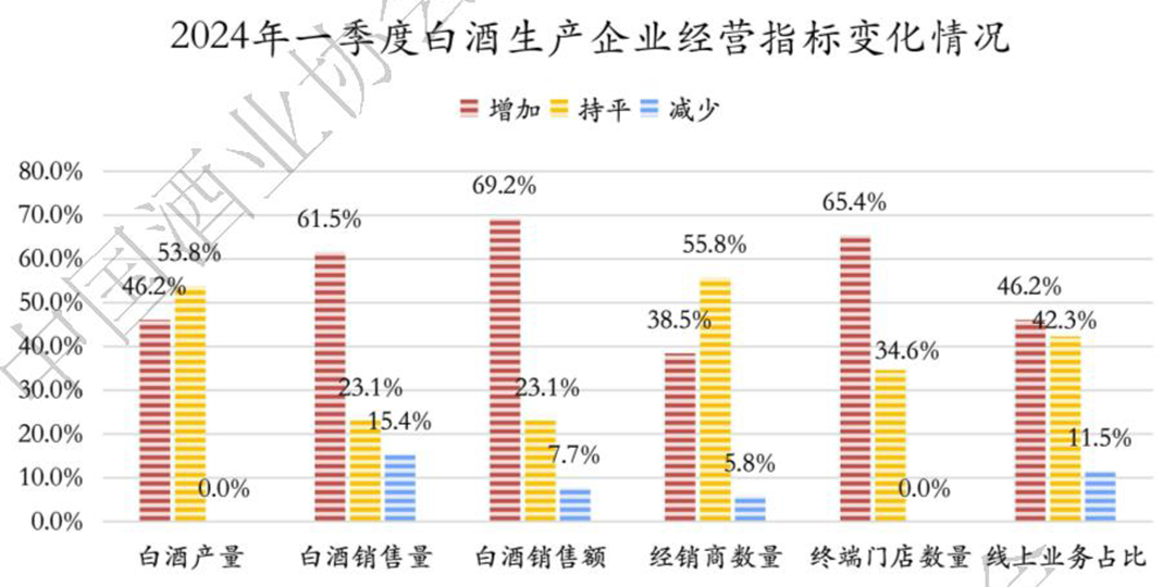中国酒业协会《2024中国白酒市场中期研究报告》显示,从酒企直营终端门店数量来看,2024年第一季度受访的100家白酒生产企业中,超过六成的酒企表示今年增加了直营终端门店数,超过3成的酒企表示今年终端门店数与上年保持持平,暂无酒企减少终端门店。