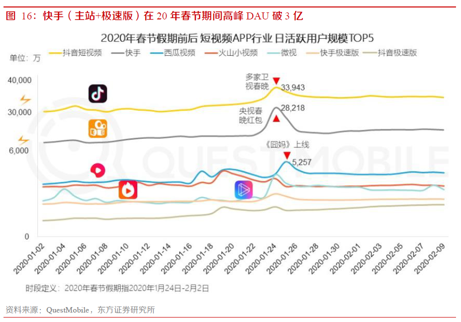 简单粗暴的砸钱获客迅速见效,从2019年Q4开始,快手和抖音的MAU差距开始不断缩小,到春节期间,快手主站APP的2.9亿DAU峰值,叠加快手极速版用户,达成DAU破3亿目标。