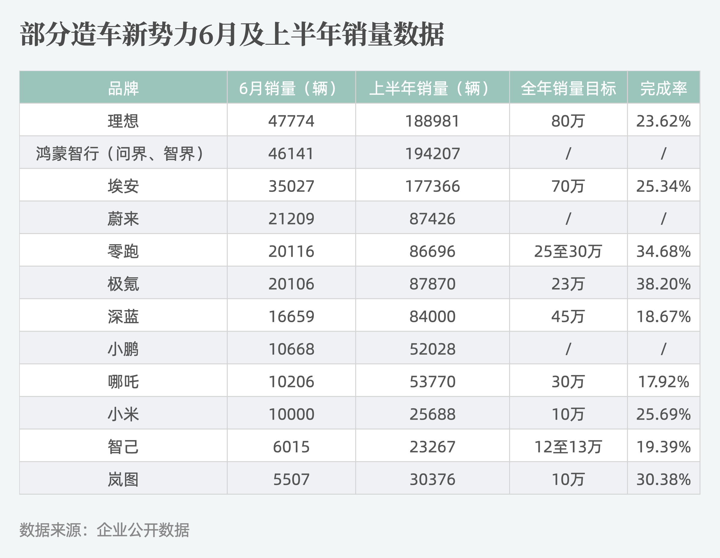 值得注意的是,此前一直表现较为突出的广汽埃安今年以来销量增长逐渐失速,6月销量环比下降12.59%至3.5万辆。上半年累计销量为17.74万辆,相比此前公布的70万辆年度销量目标,完成度为25.34%。