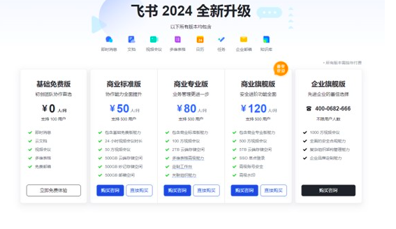 据飞书官网,飞书目前提供的服务分为基础免费版、商业标准版、商业专业版、商业旗舰版和企业旗舰版五个版本,不同版本之间在成员人数上限、云文档存储空间、在线会议同时参会人数方面存在区别。除基础免费版,三个商业版均有不同的报价,而企业旗舰版的报价则是根据定制需求确定。