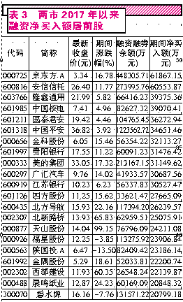 在融资个股方面,948只两融标的股,进入2017年以来有302只处于期间融资净买入状态,占比31.9%,其中京东方A、安信信托、隆鑫通用、金科股份、北方导航、西部建设、招商蛇口、碧水源、四方股份和福星股份等股期间融资净买入额居前(表3),而从上述融资买入额居前标股的总市值来看,两融投资者仍较为青睐大盘蓝筹股。