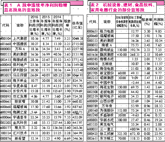 聚焦两市周期性行业的蓝筹,可以重点关注2016年业绩预增的企业(表2)。在这些公司中,预告净利润增幅最大的是旗滨集团,而去年三季报净利润增长最多的是徐工机械,股息率最高的是格力电器。叶文辉建,“比较南玻A和福耀玻璃,旗滨集团的名气不大,但该公司日熔量11600吨,是A股目前最大的玻璃集团。受益于去年四季度玻璃行业景气度大幅回升,旗滨5mm玻璃出厂价上调20元至1767元/重量箱,最终2016年公司业绩大幅增长390%~410%。对此同行业企业,旗滨的估值目前仍然较低,上方空间明显。徐工机械行业见底明确,经过了近5年的探底过程,行业去产能也到了一个阶段性底部,估值处于底部区间。另外徐工机械国企改革预期明确,公司公布的投资者纪要里明确提出要积极推进国企改革,并且首先做了增发,增发对手方主动锁定3年。近期家电涨价导致家电股大幅上涨,格力电器作为白色家电龙头,股息率一直较高。2016年第四季度到2017年第二季度,格力的内销复合增速将在30%以上,此外,与日本每百户283台的空调保有量相比,目前中国城镇保有量为每百户115台,仍存在提升空间,农村每百户39台,尚在普及阶段,中国空调行业增长仍有潜力,并且空调行业中呈现双寡头竞争,对上下游产业议价能力强,原材料价格上涨对格力的影响很小。”