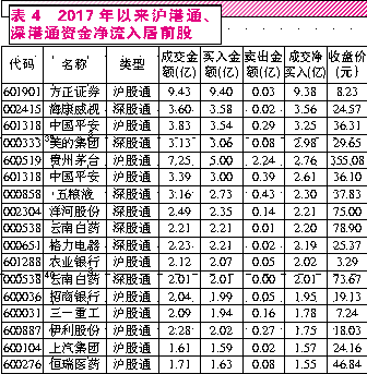 从2017年以来累计净买入额的角度来看,共有67只个股在此期间实现沪股通或深股通资金净流入,累计净流入达160.94亿元。其中,25只个股期间沪股通或深股通资金净流入均在亿元以上,海康威视、方正证券、五粮液、格力电器、美的集团等5只个股,期间沪股通或深股通资金净流入居前(表4),这些个股绝大部分是一线蓝筹品种。从行业分布来看,上述67只个股主要集中在医药生物、电子、银行等三大行业,“电子行业主要是受益于上游涨价主题,而医药、银行作为传统低估值、高分红蓝筹股的代表,自然成为北上资金的重点扫货对象,也佐证了各类机构对蓝筹股今年表现的看好。”叶文辉认为。