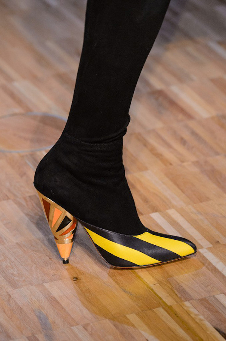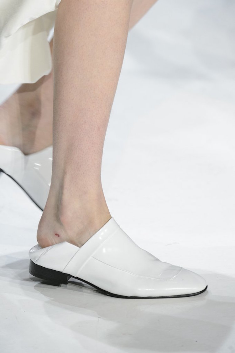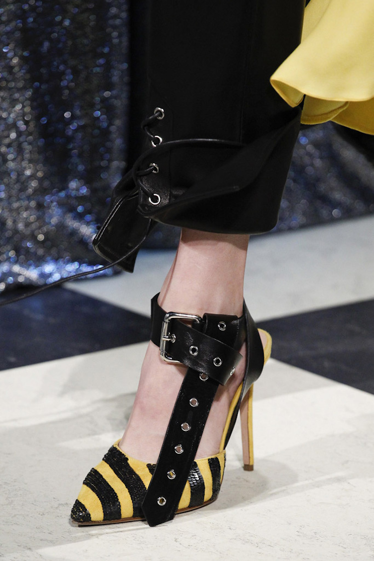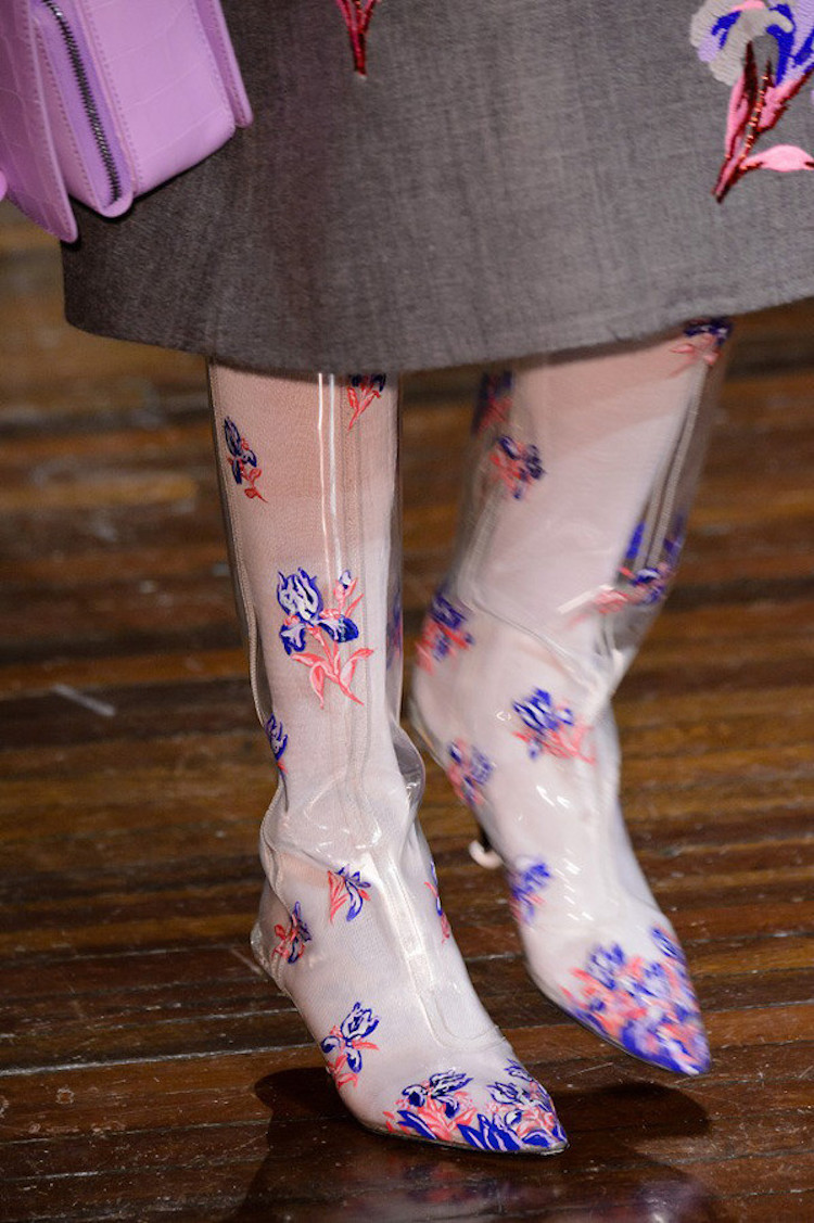 透明塑料材质在时装周上也是亮点之一。相比与Moschino的全透明“水晶鞋”感觉Calvin Klein Collection的半塑料半皮革款看起来更让人有收藏欲。Kenzo还有出透明塑料的靴款,不过比较之下觉得还是塑料款的单鞋更貌美一点。这种鞋款十分挑脚,脚型不够好看还真的是会暴露弱点。